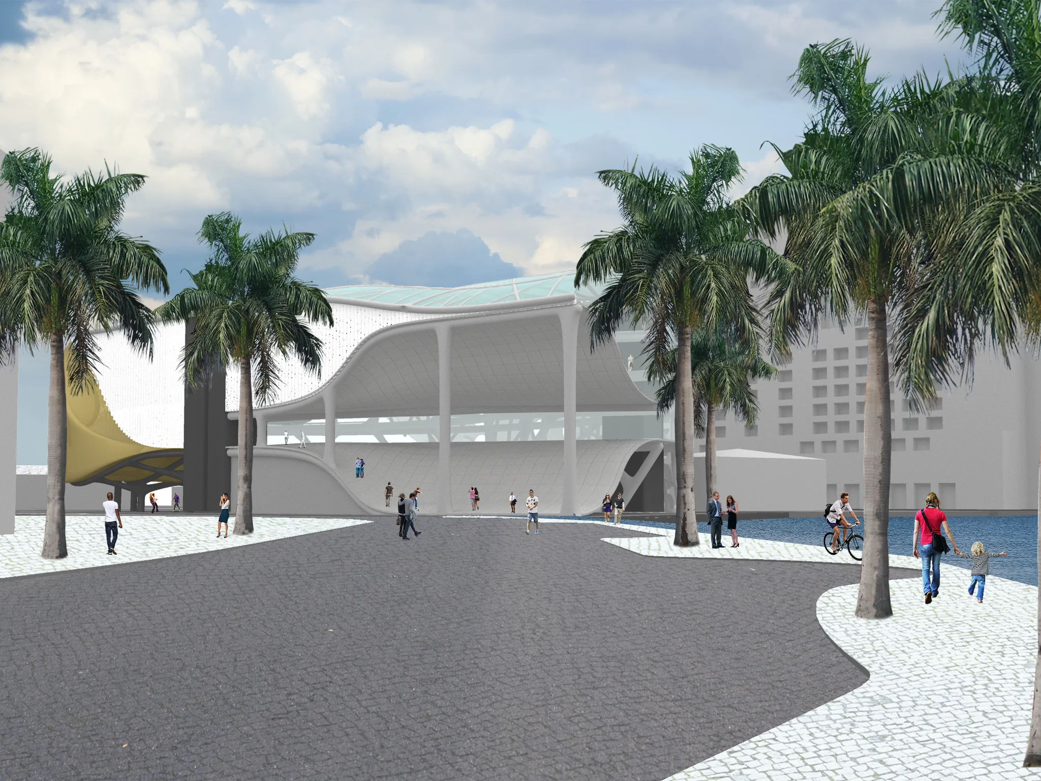 The investigation of the building interior components was derived from a study on how aquatic species function. Inspired by the movement of cuttlefish and how people can mimic this in circulation, the main entrances were designed to be just as sinuous. The curved spaces, both vertically and horizontally, called for a careful placement of program to reveal or preserve spaces to the public and private crowds. The housing units of to the sides, remain hidden from the primary corridors that lead individuals from exhibits to research centers to the curved dock leading out to the river walk.